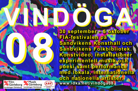 »Vindöga 08«- FIA-festivalen på Sandvikens Konsthall och Sandvikens Folkbibliotek. Video-, bild- och ljudkonst samt installationer, konserter och performance med lokala, internationella och nationella artister.