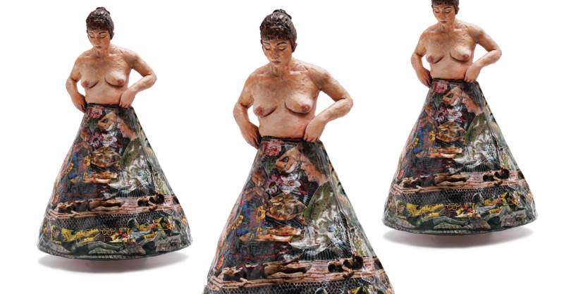 arbetar med teckning, skulptur och mixed media.