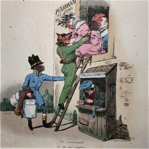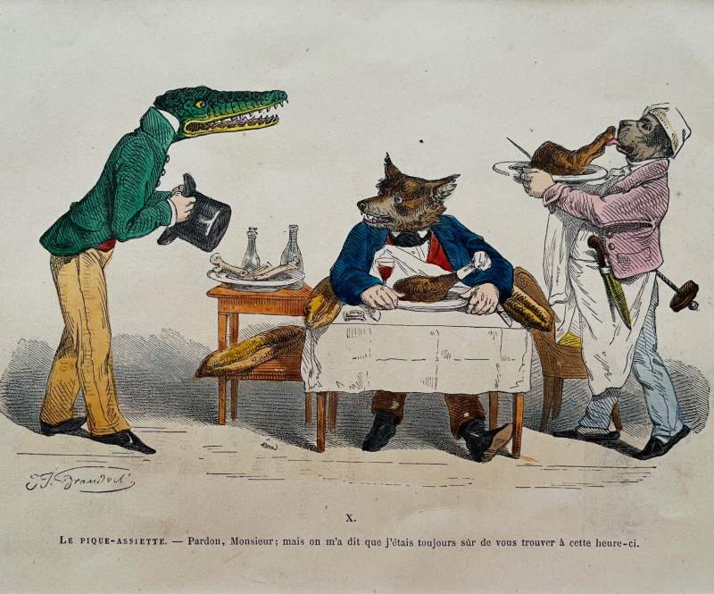 Liksom La Fontaine och Aisopos ger han sina djur mänskliga drag, kryddade med allegorier och visdom. Utställningen är ett smakprov av Grandvilles grafik och bokillustrationer.